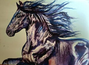 Depiction stylish black horse by professional an artist, Materials gouache, acrylic, watercolour paper.