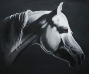 Depiction stylish black horse by professional an artist, Materials gouache, acrylic, watercolour paper.