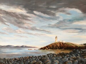 A serene harbor scene with boats and a distant industrial skyline, reflecting in tranquil waters under a soft evening sky.