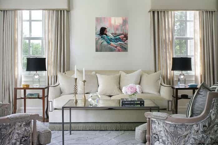 This painting is of a woman seating on a couch which is filled with light and ambiance.