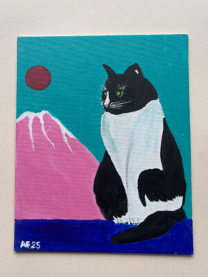 The cat contemplates Mount Fuji