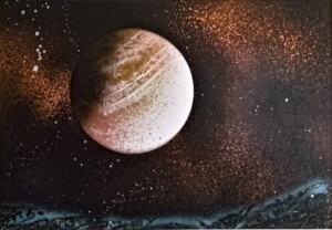 "Using vibrant spray paints and a combination of stencils and freehand techniques, I translate these imaginary planets onto 3 mill textured board . Each one bursts with unique features, like swirling storms on a gas giant or luminescent crystals embedded in a volcanic moon. They're not just planets; they're portals to fantastical realms waiting to be explored."