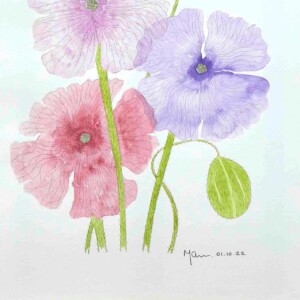 I work as a professional 3D design consultant.I have been painting watercolours for more than 30 years using the time to relax during busy period of work. When the first lock-down period started I decided to spend more time in the garden drawing and painting. I only draw and paint plants as I get my inspiration from the plant forms and shapes. I start off with a sheet of 300gm cold pressed watercolour paper and sketch onto it using a 0.3mm propelling pencil creating all the details, forms and shapes before adding Daler Rowney watercolour paints. Some plants lend themselves to a more detailed structured painting while others move into a more abstract form, this can be seen in some of my latest poppy painting with the translucent quality of the petals and the way they overlap creating different colour shades. All my paintings are signed and dated with the day the painting was completed.