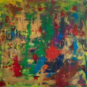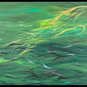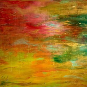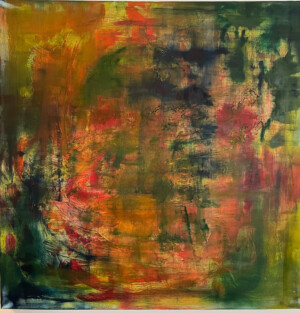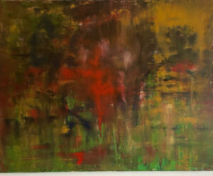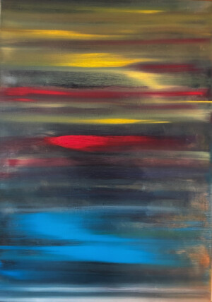 My work is abstract and based on movement and colour. I generally begin without a plan and love working with oils. I’m drawn to their texture, their smell, and the way they move across the canvas. I am also deeply drawn to the sea, sky and land, and these elements often influence the feeling and palette of my work. Sometimes, once the oils have dried, I draw over the work with chalk or pencil. However, oils form the basis of all my work.